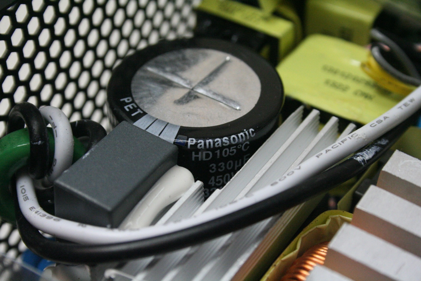 Nel primario è presente un tre condensatore elettrolitico Panasonic, da 450V e 330 μF, certificato a 105 °C.